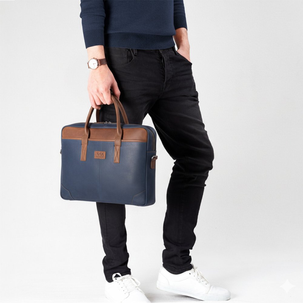 Elegantná kožená taška na notebook Valmio Denton 2.0 je vyrobená z kvalitnej prírodnej kože, ktorá časom získava prirodzenú patinu. Táto verzia kombinuje modrú a hnedú kožu.